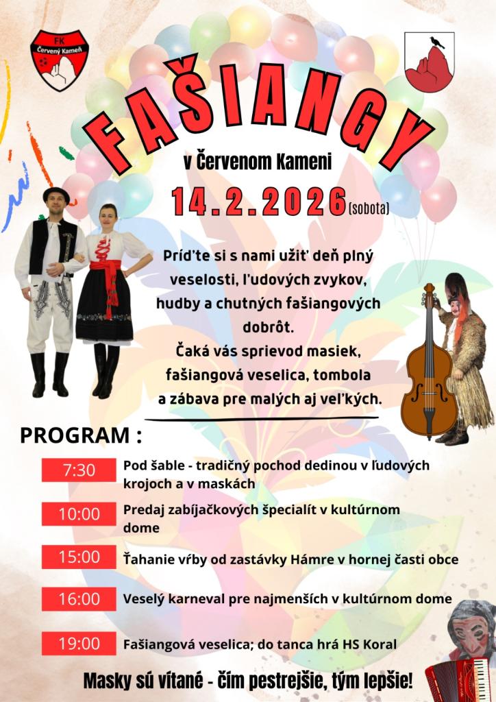 Čaká vás deň plný ľudových zvykov, hudby, zábavy a chutných fašiangových špecialít. Súčasťou programu bude sprievod masiek, tradičný pochod obcou, fašiangová veselica, karneval pre deti aj večerná zábava s hudbou.