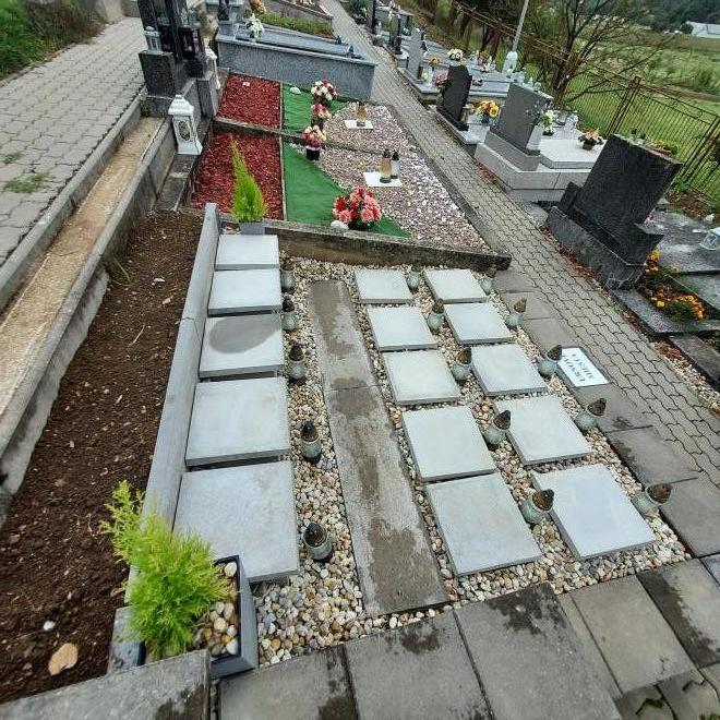 Položenie nových chodníkov v areáli cintorína, vyhotovenie oporných múrov
